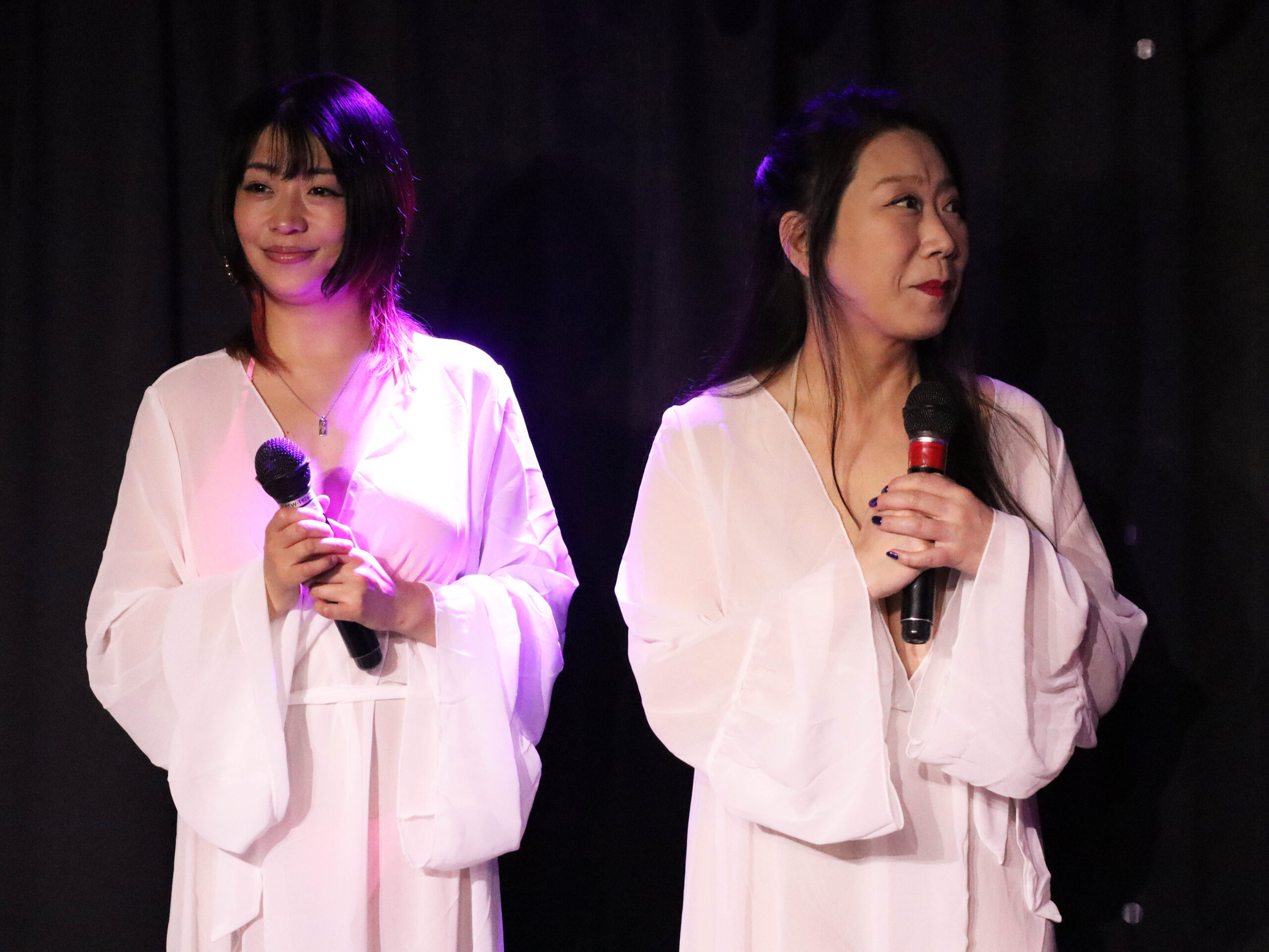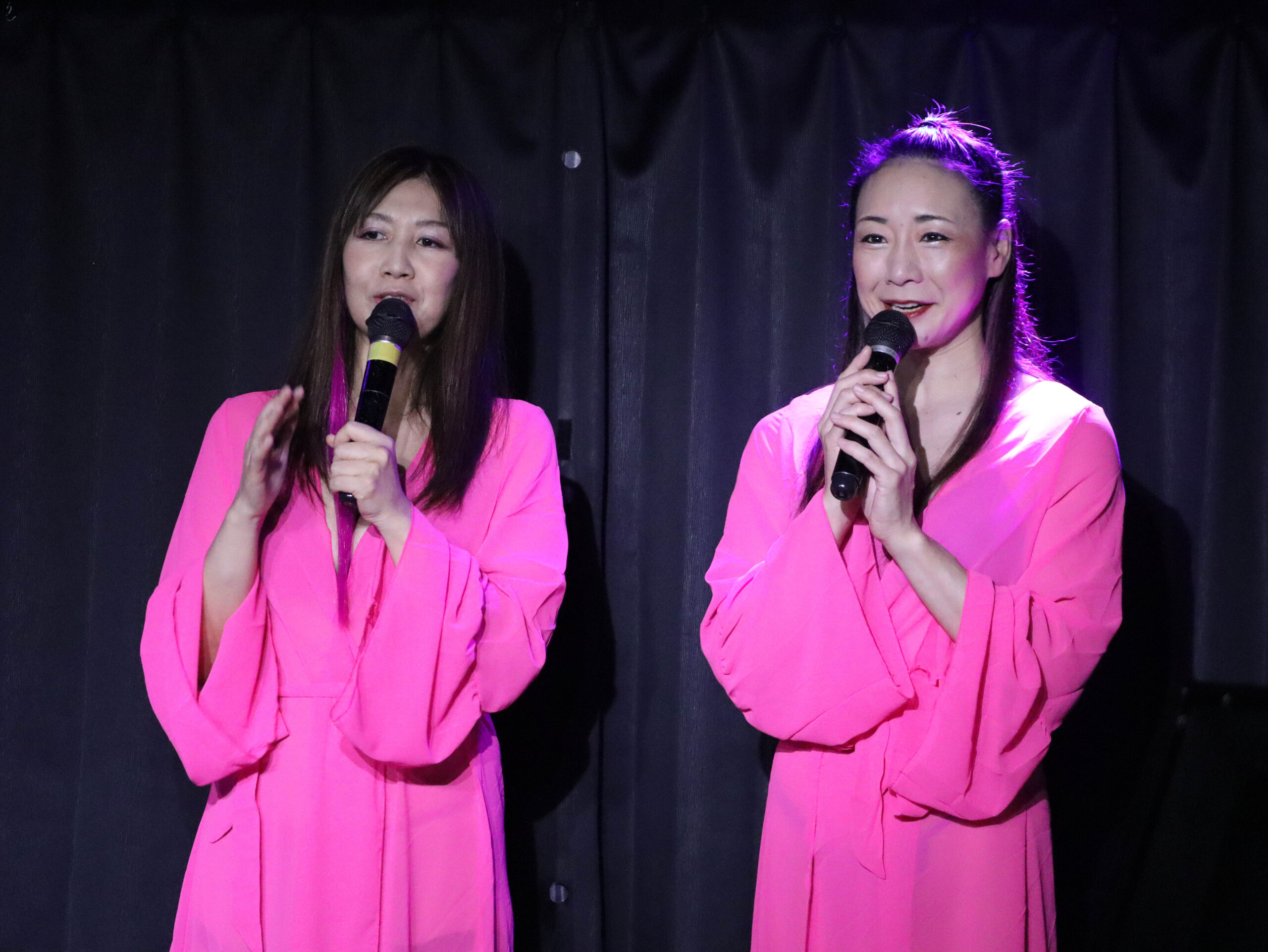 三人はピンクのローブ姿で登場。なんと、その下にはマイクロビキニ水着を着用しているとのこと。早くも会場のボルテージが一気に高まります。