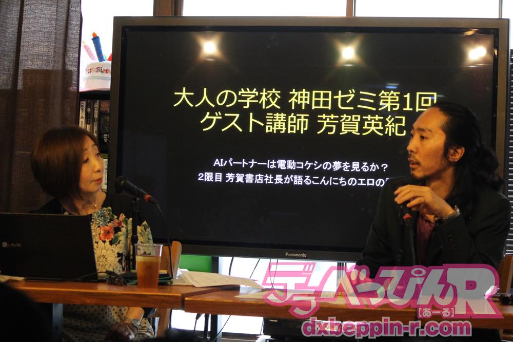 4月15日(日)、新宿のLive Wire HIGH VOLTAGE CAFÉにて、大人の学校神田ゼミ第1回「AIパートナーは電動コケシの夢を見るか?――エロス未来派が生きる平成30年の現実」が開催。