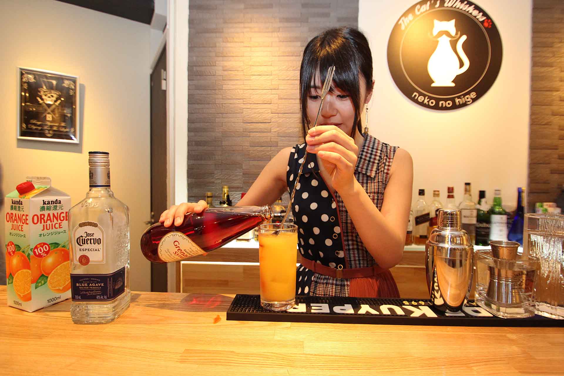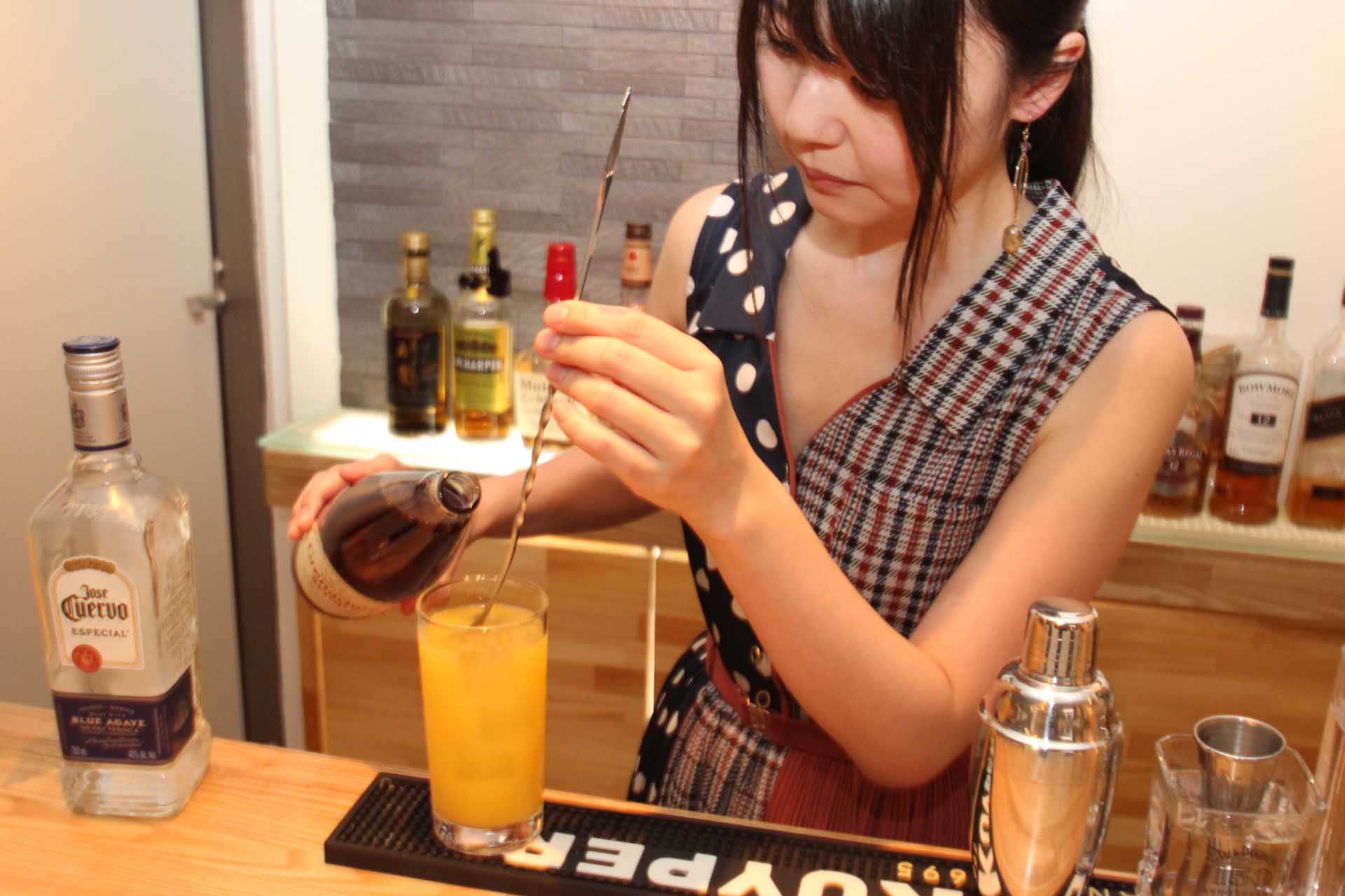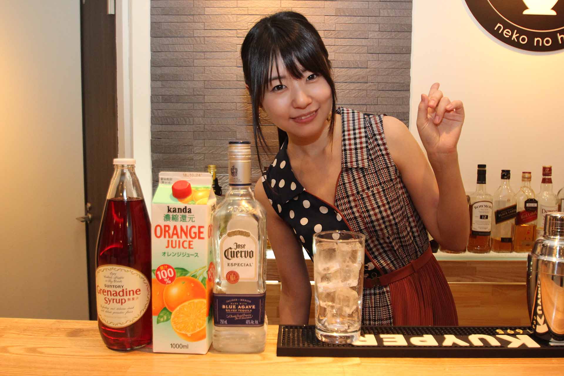 戒音店長の実演を見たあとは、さっそくテキーラ・サンライズにトライするつぼみたん。