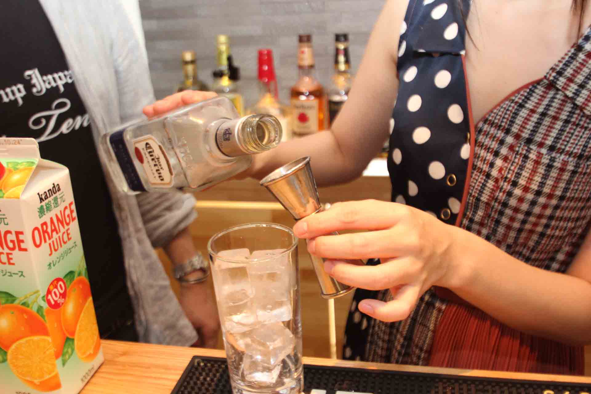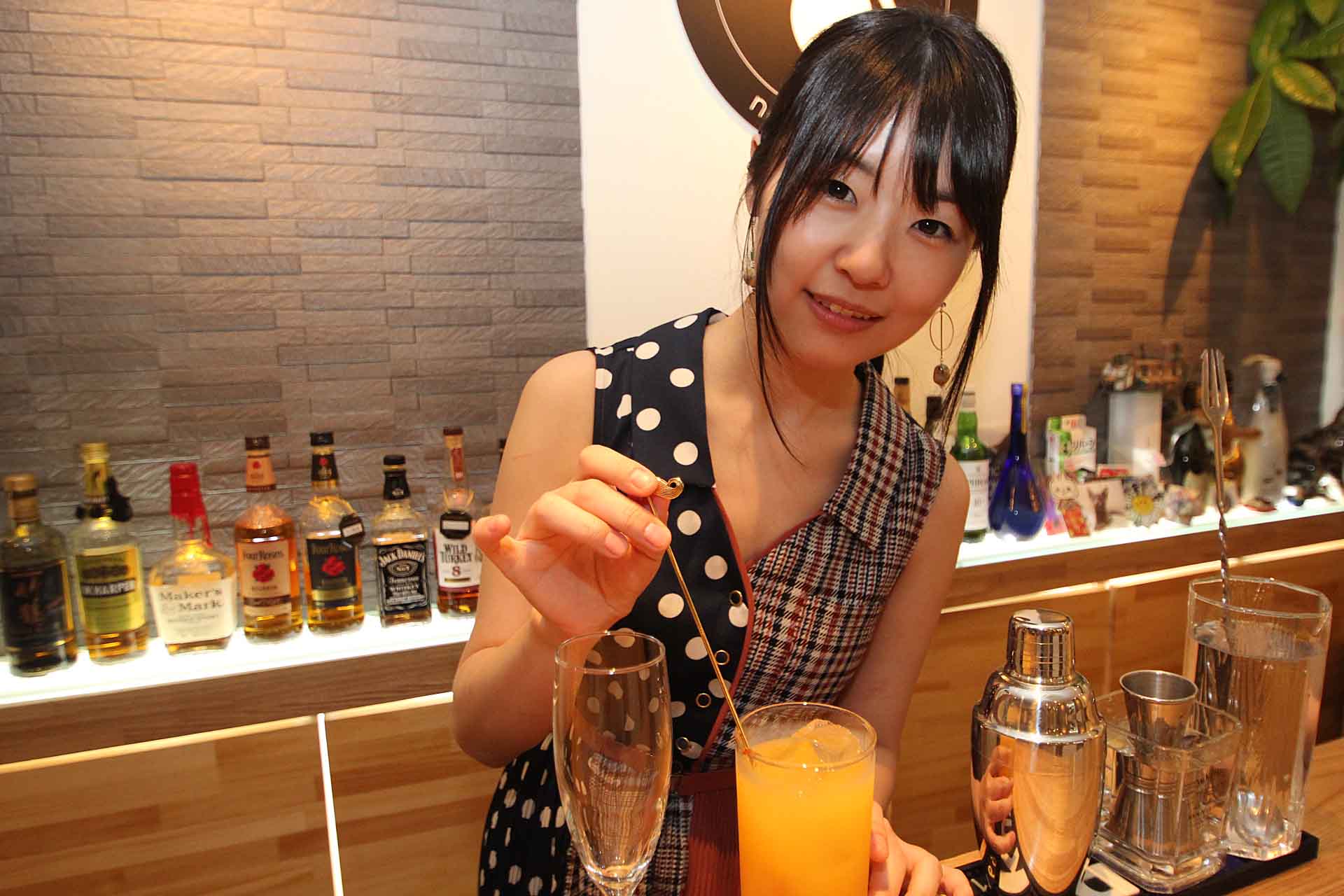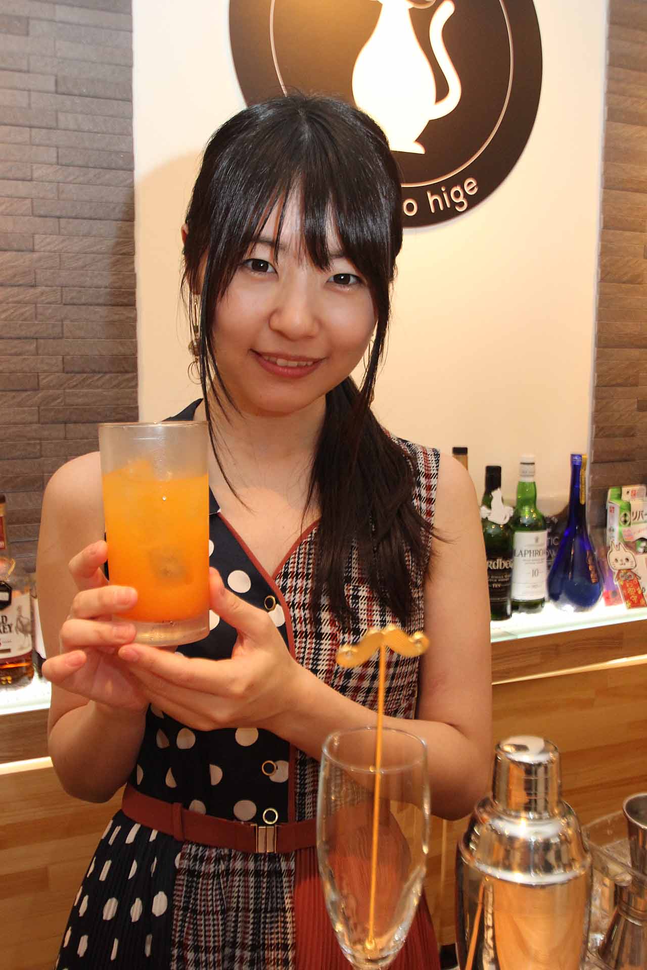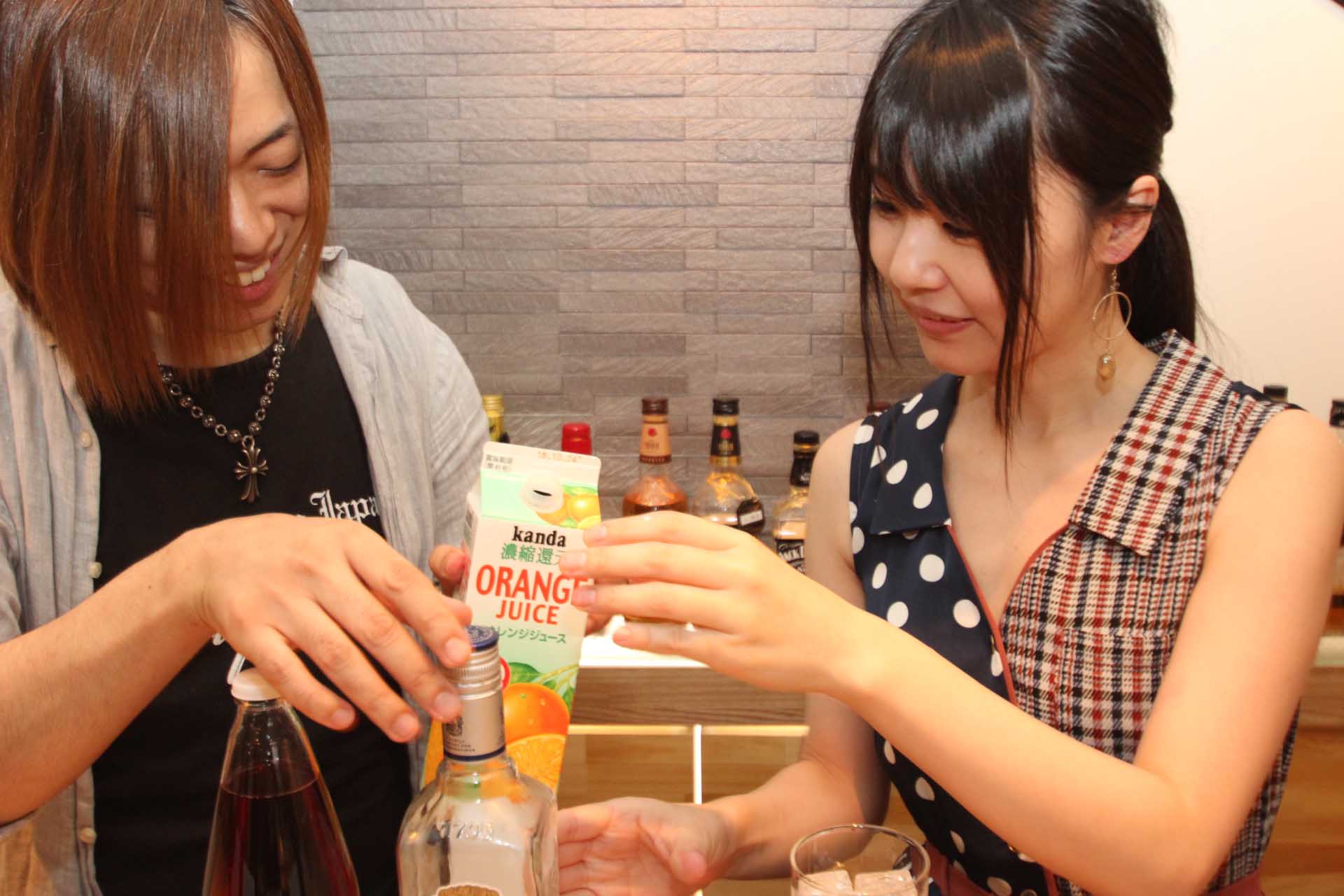 戒音店長の実演を見たあとは、さっそくテキーラ・サンライズにトライするつぼみたん。