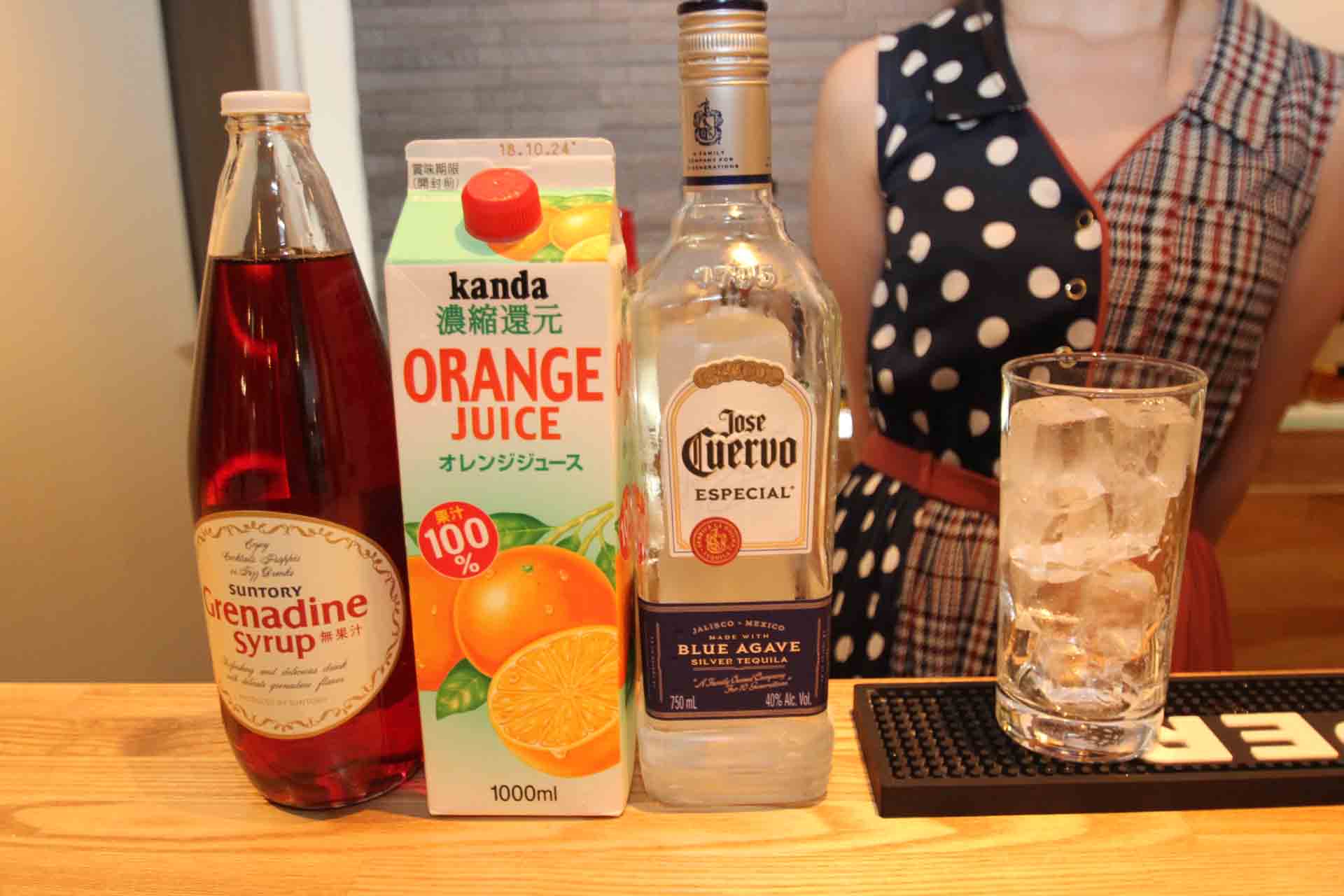 用意するのは、テキーラとオレンジジュース、そしてグレナデンシロップにグラスいっぱいのクラッシュドアイス。