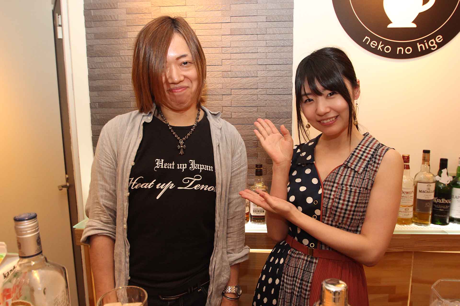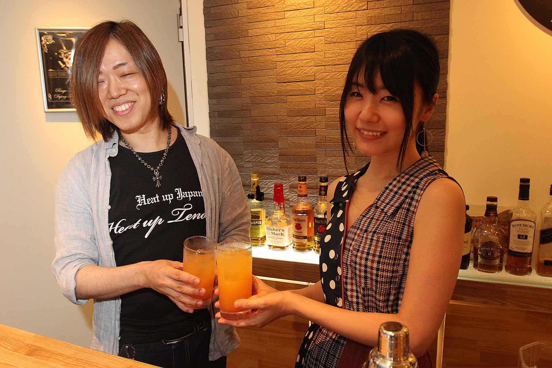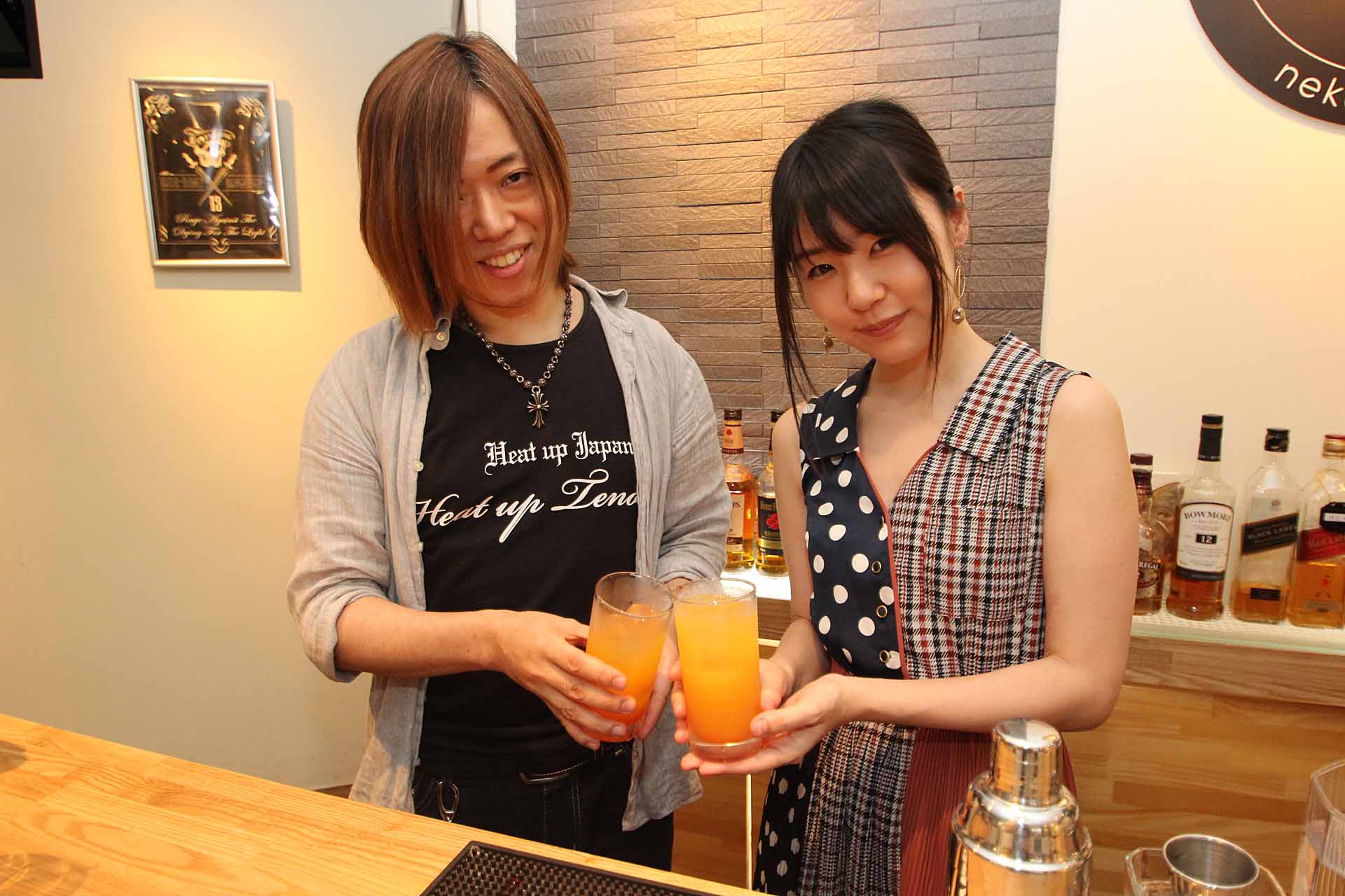 じつは店長の戒音さん、昔っからのつぼみたんファンということで、ナマつぼみとご対面して緊張&デレっぱなし状態ww。そんな店長さんに、まずは女性でも飲みやすいカクテルの定番テキーラ・サンライズの作り方を教わります。