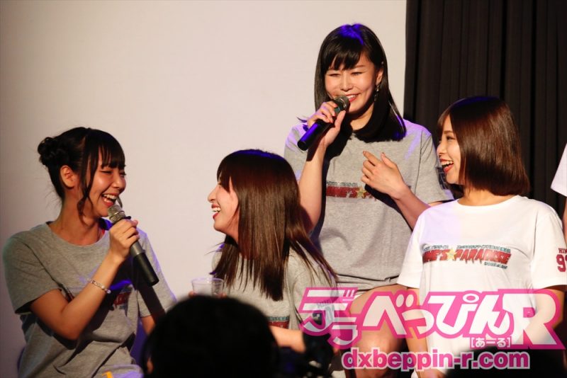 シャンパンが贈られご機嫌なマイパラ娘とファンが乾杯! 1部のトークコーナー「マイパラ娘が世の中の女に怒る夜」がスタート。タイトル通り、ムカつく同性をぶった斬ります(笑)。