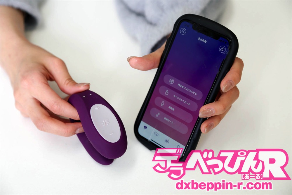 真中 「Satisfyer Connect(サティスファイヤーコネクト)」をダウンロードして設定するだけで使えます。1人で使う場合はリモコンとして使えます。元から入っている振動パターンと強弱の他に、好きな振動パターンや強弱をプログラムすることもできます。あとは周囲音に合わせて振動します。