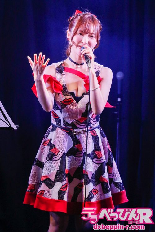 唇があしらわれたオシャレなワンピース姿で登場したもえちゃん。冬にちなんだ歌や演歌まで披露し、幅広い音楽性を披露します。
