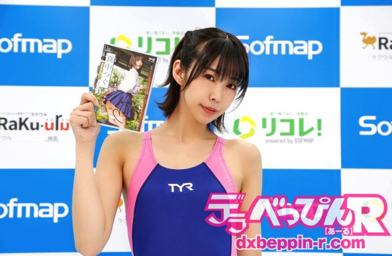 作品内でも着用した超ハイレグ競泳水着姿で現れたつぐちゃん。多くの取材陣に囲まれて、初々しく撮影ポーズをとる姿が抜群にキュートだった。