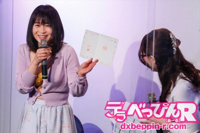 第1部は私服姿で登場した2人ですが希さんはすでに胸の部分がはだけており、下着がチラチラと見えるサービスぶり。一方、進行を任されたいろはさんはメガネ姿でしっかり進行。この対照的な2人だからこそ、イベントは面白いのです。
