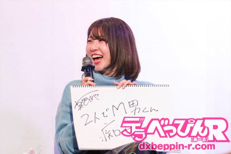 1問目は「お互いが共演したら、どんな作品に出たいか」を聞かれると、あやちゃんは2人でM男くんを痴女」と解答。もえちゃんと美咲ちゃんは以下の写真の通りで、美咲ちゃんと意見が一致。