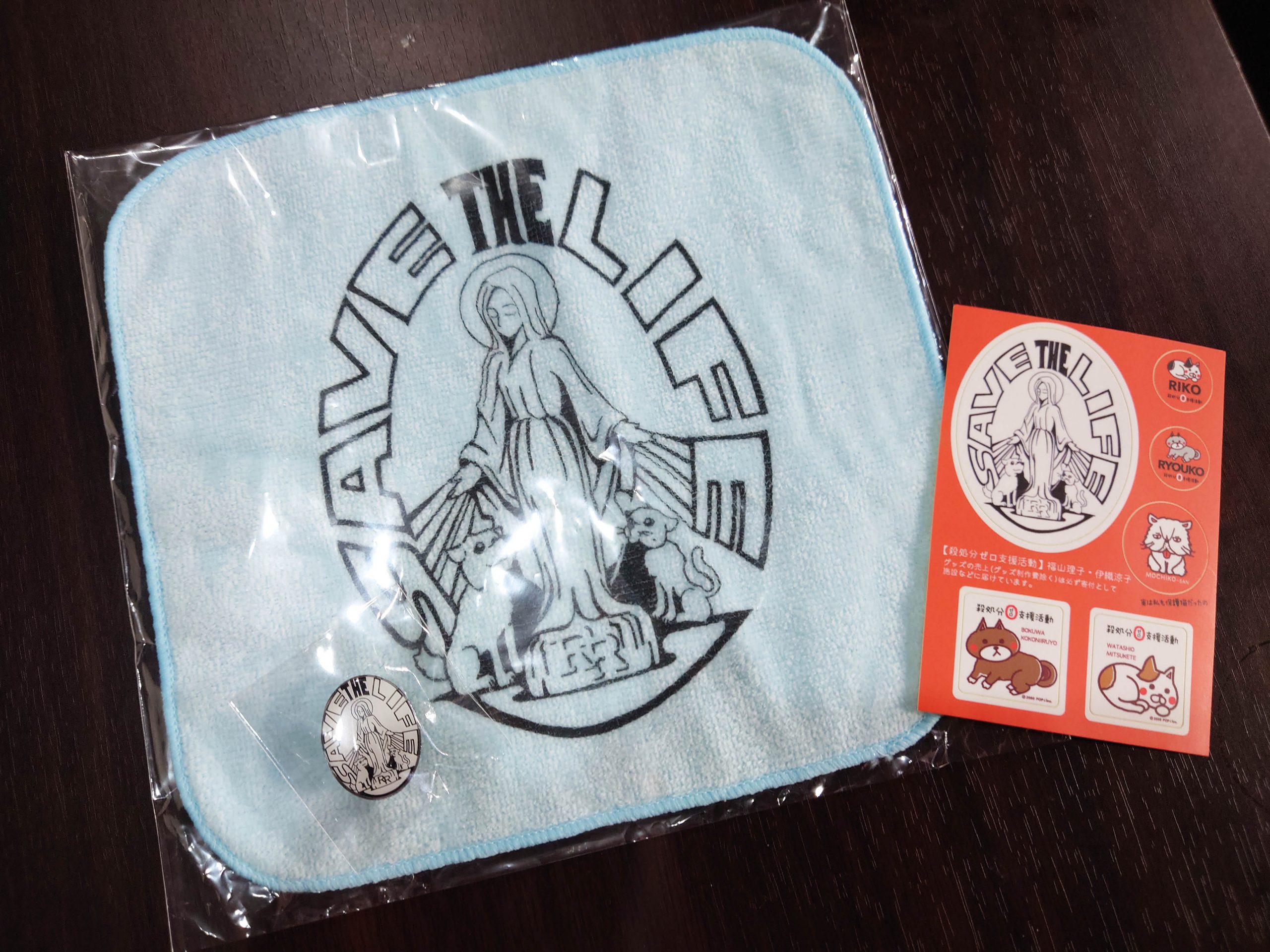 こちら、ピンバッジとハンドタオルとステッカーです。動物だけではなく、すべての命を守るマリア様をモチーフにしているそう。なんだか御利益がありそうですね。
