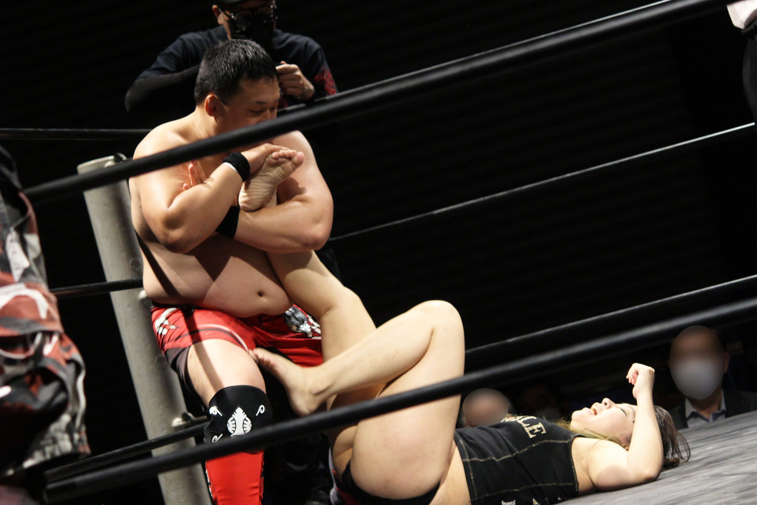 紫龍みおとの直接対決では善戦するも、やはり鳳華のダメージは甚大だった模様。二人ともほぼ全裸状態になった末、結果は紫龍みお&田馬場貴裕コンビのチャンピオン防衛となりました。