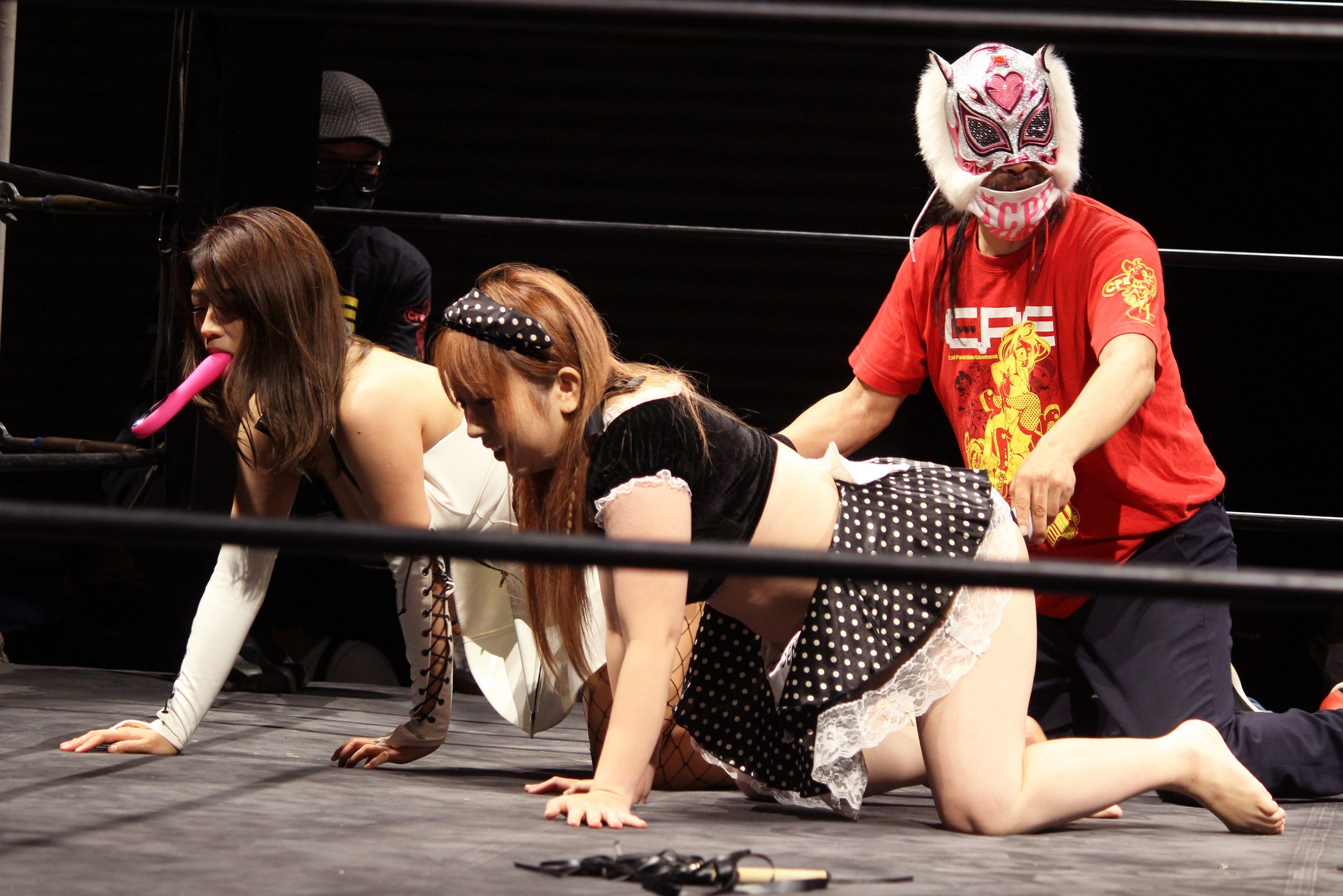 第二試合はアダルト凶器公認SEXY ART試合。対戦カードは、範田紗々VSきゃんでぃぺろみのセクシーアイドル対決。この試合ではアダルトグッズを使用した攻撃が認められています。というか、これは強さを競う試合ではなくエロさを競う試合。エロポイントを多くゲットできた方の勝利となります。