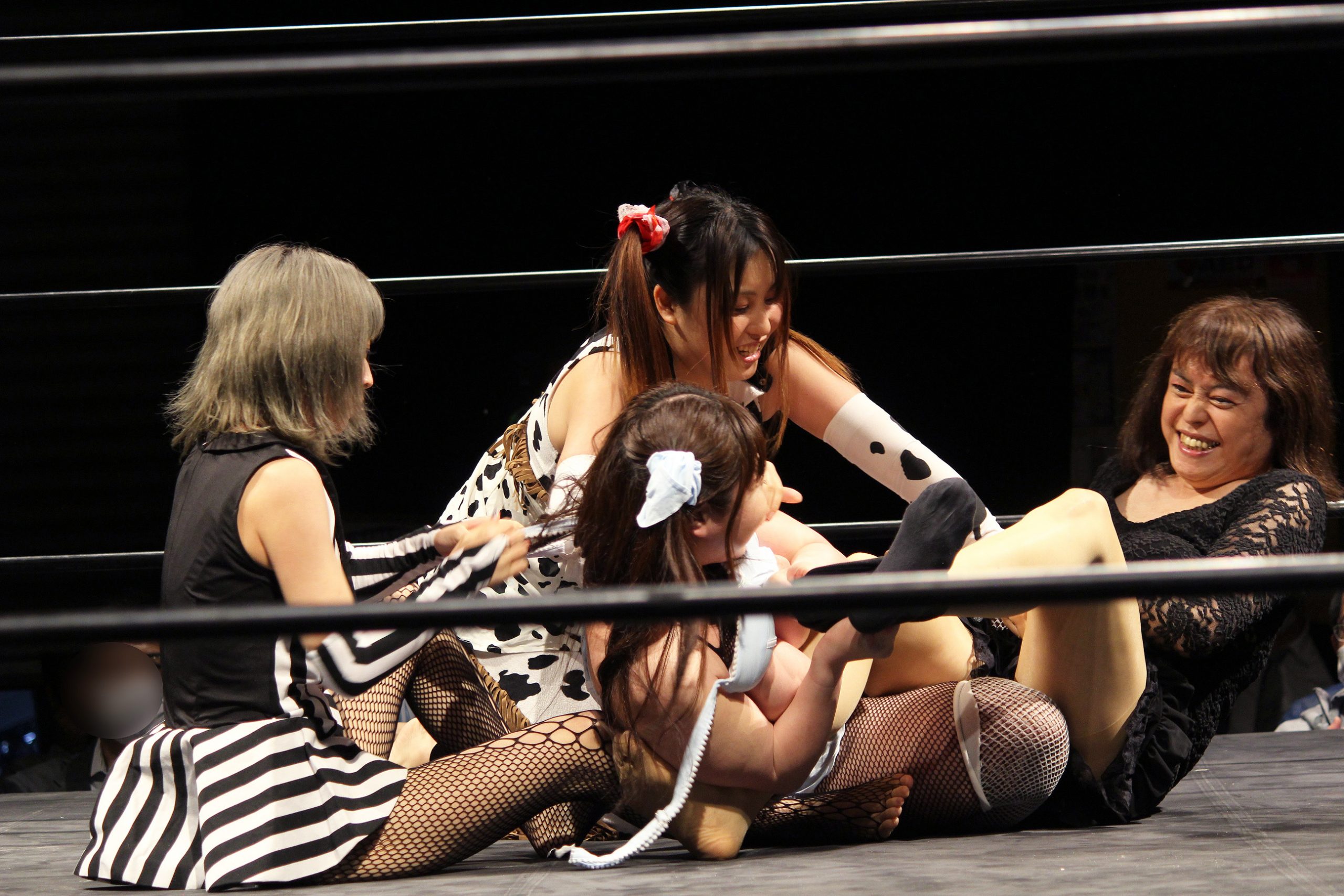 第三試合は、敗者乱交官能小説朗読!追い剥ぎ4WAY DANCE。対戦カードは、びりりあんみりんだVSアラレ王VSつむゴキVSみでぃ。4人での追い剥ぎマッチとあって、試合開始からくんずほぐれつのまさに乱交状態。超カオス!