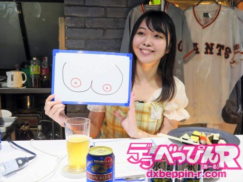 まずは「乳輪占い」のコーナーからスタート。自身の乳輪のイラストを描く2人ですが、ともにGカップを誇るだけに、どのようなイラストになるのか楽しみです。くるみちゃんが今日の乳輪コンディションを「固めです」と言えば、芽愛理ちゃんも「固めで濃いめ。しかも勃ち上がっている」とかわいい顔をして詳細に語ってくれます。