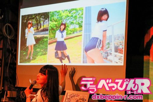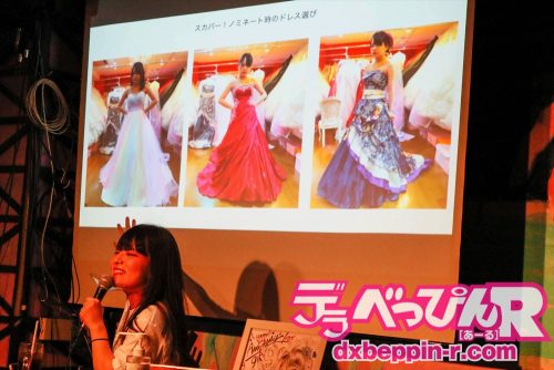 まずはデビュー9周年ということで数々の写真とともに、その歴史を振り返ります。デビュー時の初々しい姿がスクリーンに映し出されると、ファンからは「かわいい!」の声援が飛びます。また、これまで数々のAVアワードにノミネートされた姿や、ギャル役をやるために金髪にした姿も映し出され、本人もファンも当時を懐かしむ様子が見られました。