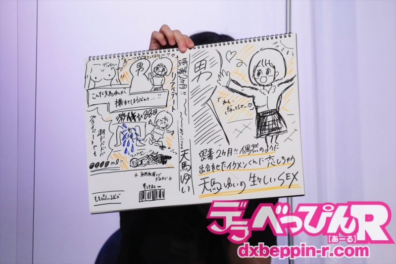 ゆいちゃんは6月10日にデビュー作『自宅大好きでサブカル好きな引きこもり女子が中出しされたくてAVデビュー 天馬ゆい』が発売されたばかりで、「やっと発売しました! ありがとう」と挨拶。