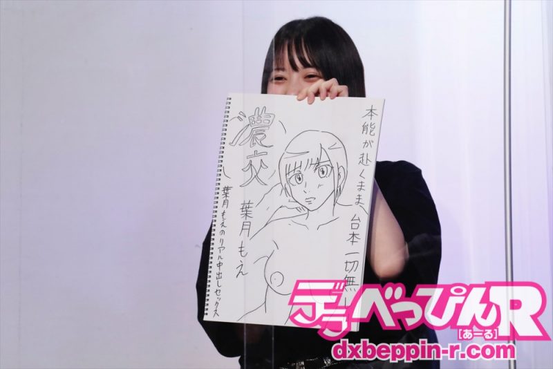 内容を聞かれると「パッケージの表裏、バーコードまで描いた。密着ドキュメンタリー作品でデートシーンから始まり、ホテルに行っておっぱいド~ン! イチャラブハメ撮りドキュメンタリーで、イケメンの若い男が好きという内容」と詳しく説明。