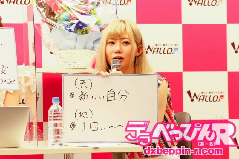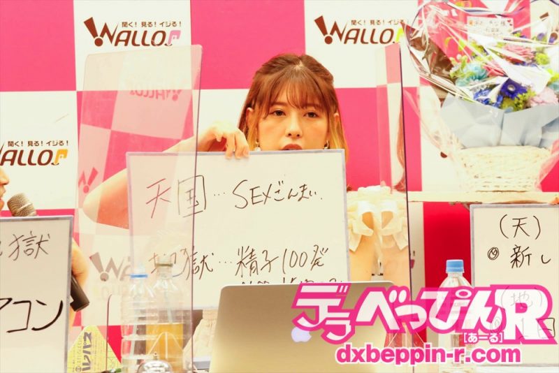 まずは「AV女優の天国と地獄」のテーマから入り、れなちゃんは「何よりセックスが好きだから日々できることが嬉しい。からみの後、他人になる感じが好き」と天国を告白。地獄は「精子100発・400ml」と書き、「ごっくんは好きだけど、多くて30発かな」とのこと。さすがに100発はキツいです。