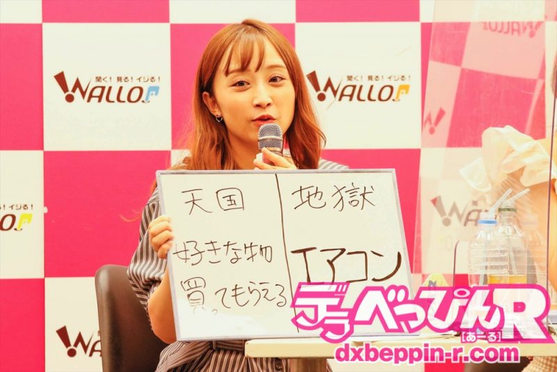 歩実ちゃんの天国は「好きなものを買ってもらえる」で、「撮影の時にスタッフさんに欲しいものを言うとすぐに買ってきてくれる」とのことでした。ちなみに欲しいものと言ってもブランド品や洋服とかではなく、食べ物や医療品など撮影現場で必要なものです。地獄は「エアコン。音が入るからエアコンを消すので夏は暑くて、冬はソープものがキツい」とコメント。動画撮影あるある話です。