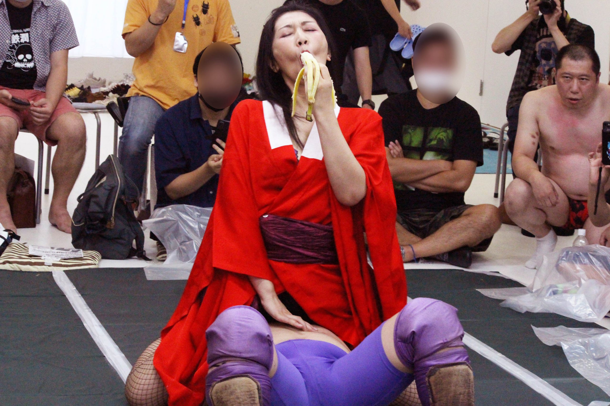 第2試合は、逆バナナマッチ!対戦カードは塙純一 vs 織田ドリル!普段のCPEであればバトルロワイヤルに勝利した女性選手が、バナナをどれだけエロく食べれるかを競う試合なのですが、今回は違います。2人の男が15分タイマンフル勝負。3カウントを取るたびにバナナフェラ嬢からバナナ越しのフェラというご褒美……ではなく、どれだけエロくフェラをさせることができるかを競う試合となっております。そして、今回のバナナフェラ嬢は我らが熟女神・伊織涼子