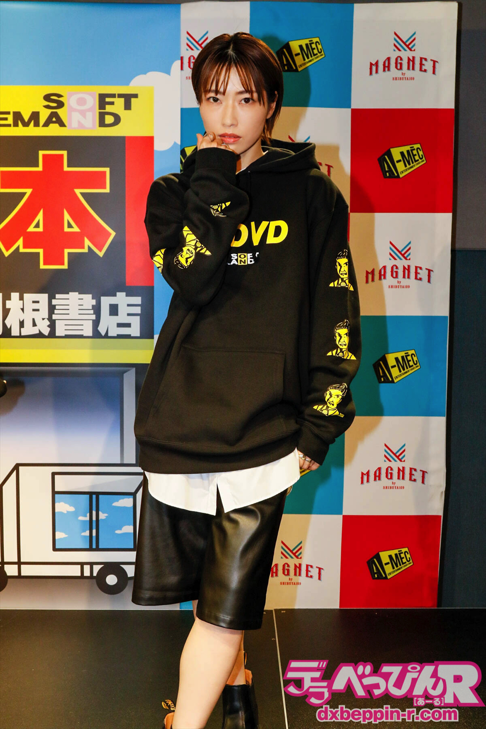 まさみちゃんは「利根書店さんとのコラボアイテムになっていまして、袖に利根書店の部長様がデザインされているので、ここがポイントかと思います。後ろはシンプルなデザインです。いま着ているのはラージサイズです。私の身長が162センチだから、股下10センチくらいまでの長さがあります。女性でも着られている感がなくて、このサイズでも全然、大丈夫です。今日はボーイッシュにしてきました」と黒のパーカーをボーイッシュに凛々しく着てくれました。