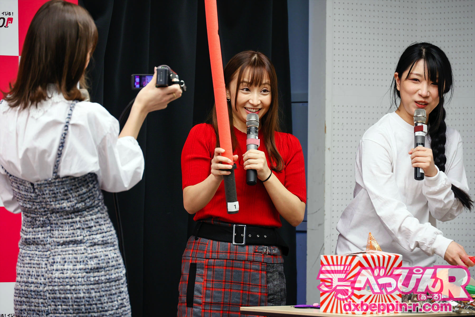 あゆみんは魔女のほうきとパペットを使い、くすぐり系のAVを再現。久々の物ボケだけに「いままででいちばんキツかった」とつぶやくと、「困っている姿がかわいかった」とれなぱんがフォローします。