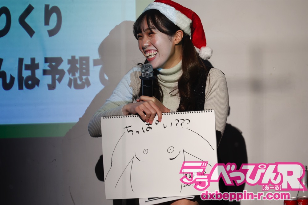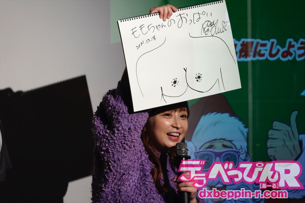 まずは「どんなおっぱいをしているか?」の質問が出されると、あゆみんが予想したおっぱいのイラストを描きますが、ももちゃん曰く「デビュー作のキャッチコピーに『ちっぱい天使』と入っているBカップです」とちっぱいなイラストを自身では描きました。実際にどのようなおっぱいなのかはAVを観て確認しましょう!