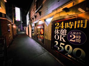 ラブホ街では、デリヘル嬢が足速にホテルへ入る姿がありました。
