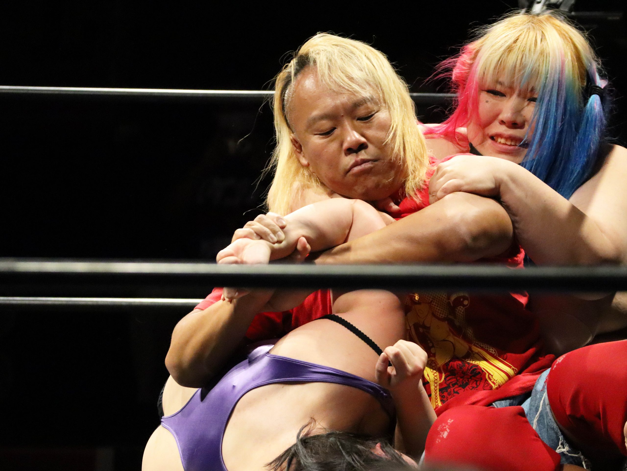 真白の厚い尻肉を前に逆エビ固めが失敗に終わり、まな板ショーは未遂に(笑)。しかし、佐野が執念を見せて、試合は見事に佐野の勝利となりました。