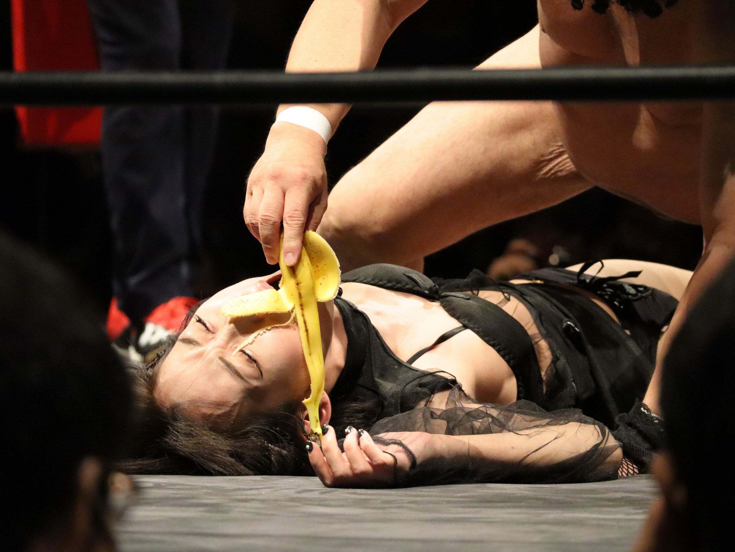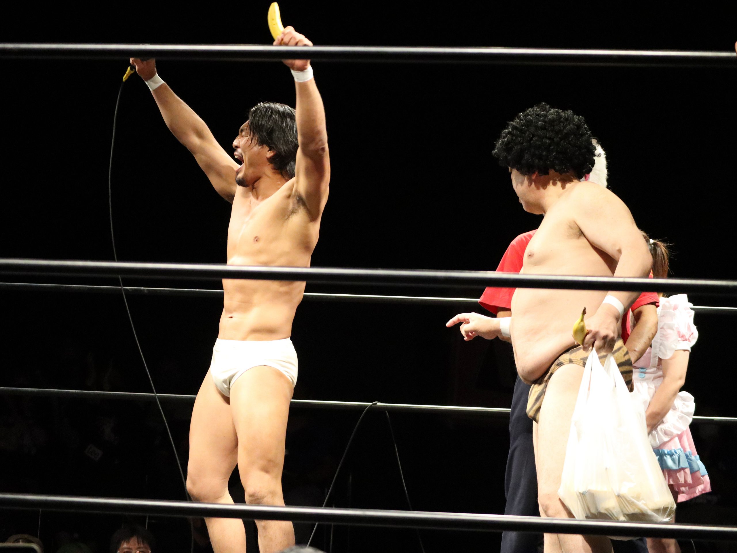 バナナマッチといえばCPEの十八番。ファイターたちが戦った後に、勝者がバナナでのエロいパフォーマンスをすることでポイントを積み重ねていき、最終的にポイントを多く獲得した者が真の勝者となる恒例企画です。