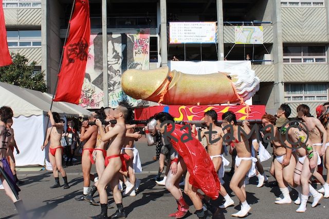 祭りは、男神輿と女神輿がそれぞれに、ふんどし姿の男女によって広いキャンパス内を練り歩いた末にメイン会場で出会い、ついには合体して男神輿の御神体の先端から、歓喜の紙吹雪を噴射するという、奇祭ならぬ〝珍祭〟だった。
