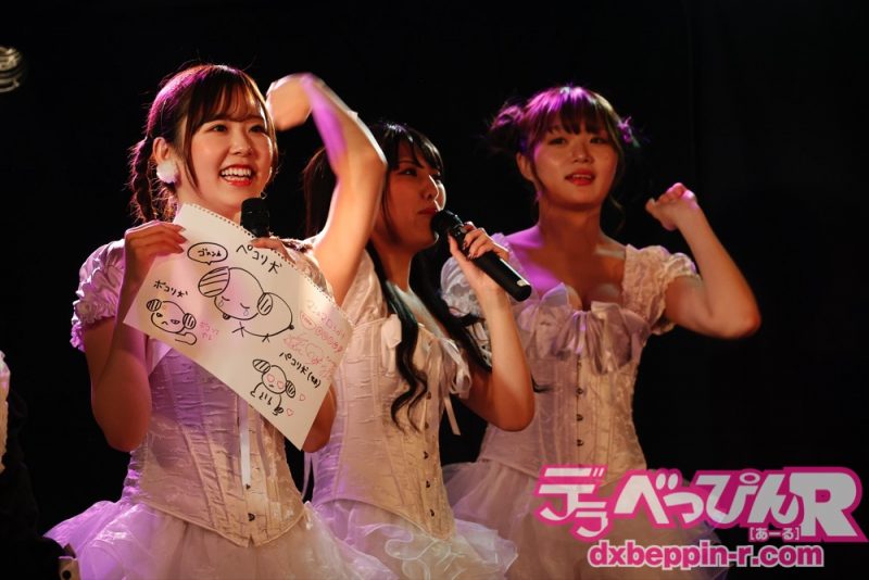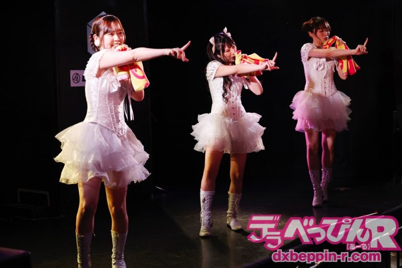 コロナ禍以前は対バンライブで圧倒的存在感を放ってきたマシュマロ3d+ teamメレンゲですが、現メンバー(倉木しおりちゃん、松宮ひすいちゃん、三浦かなみちゃん)での対バンライブは初! それだけに会場には「お兄ちゃん、お姉ちゃん」と呼ばれるファンが集結。大声援の中、オリジナル曲を3曲熱唱してくれました。