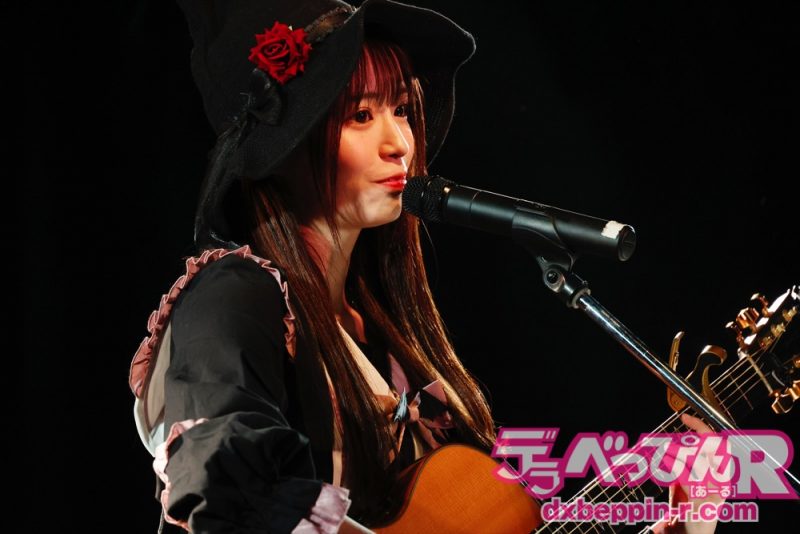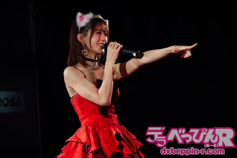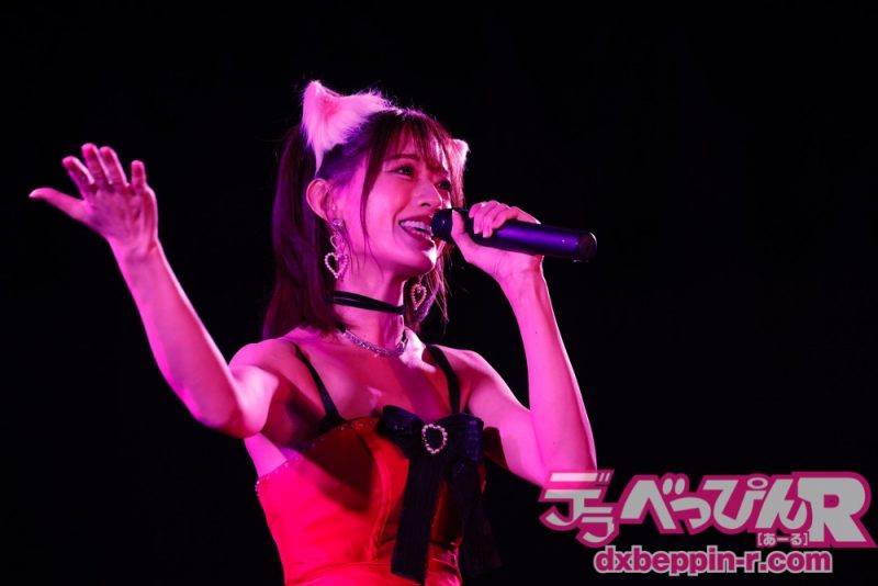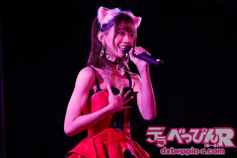 深紅の衣装に猫耳を付けて4曲全てオリジナル曲で勝負! これがアーティストの強みです。1曲目は『真夜中のカフェテリア』をオシャレな雰囲気で歌いファンを魅了します。曲後は「オリジナル曲から私がかわいいと思った曲を4曲選びました」とコメント。