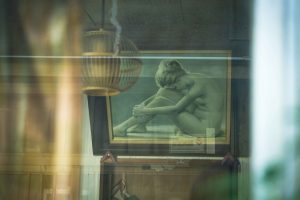 別の部屋には女の子が膝を抱える悲しすぎる絵画が掛かり、手前には金色の招き猫が寂しげに佇んでいました。