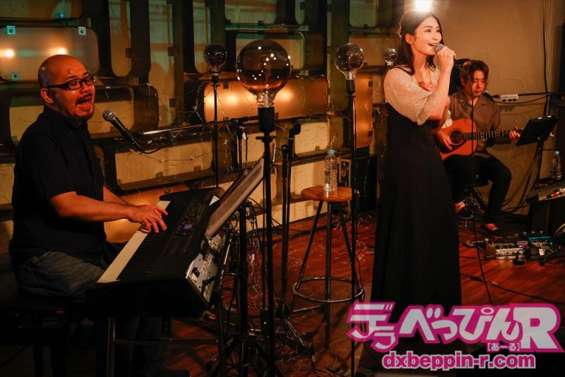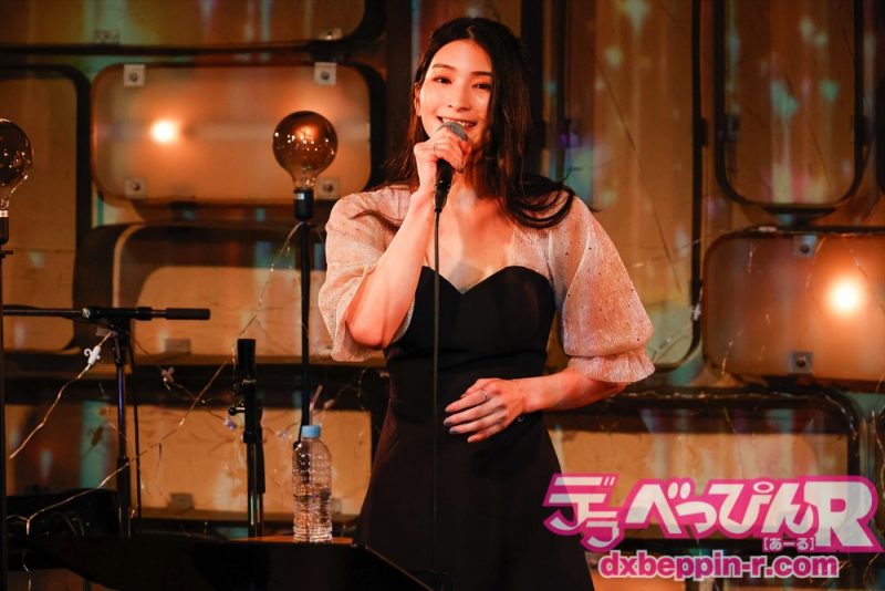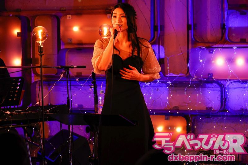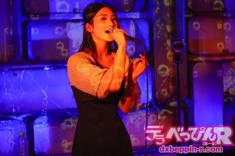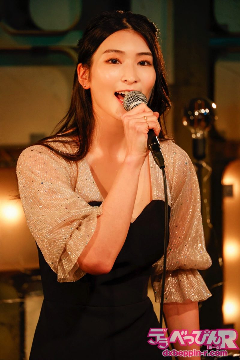 4曲目は『White Love』(SPEED)を歌い、会場からは手拍子が起こります。5曲目は『接吻』(中島美嘉バージョン)をアダルティな雰囲気を漂わせ歌い、6曲目は『翳りゆく部屋』(荒井由実)を伸びのある声で聴かせてくれました。