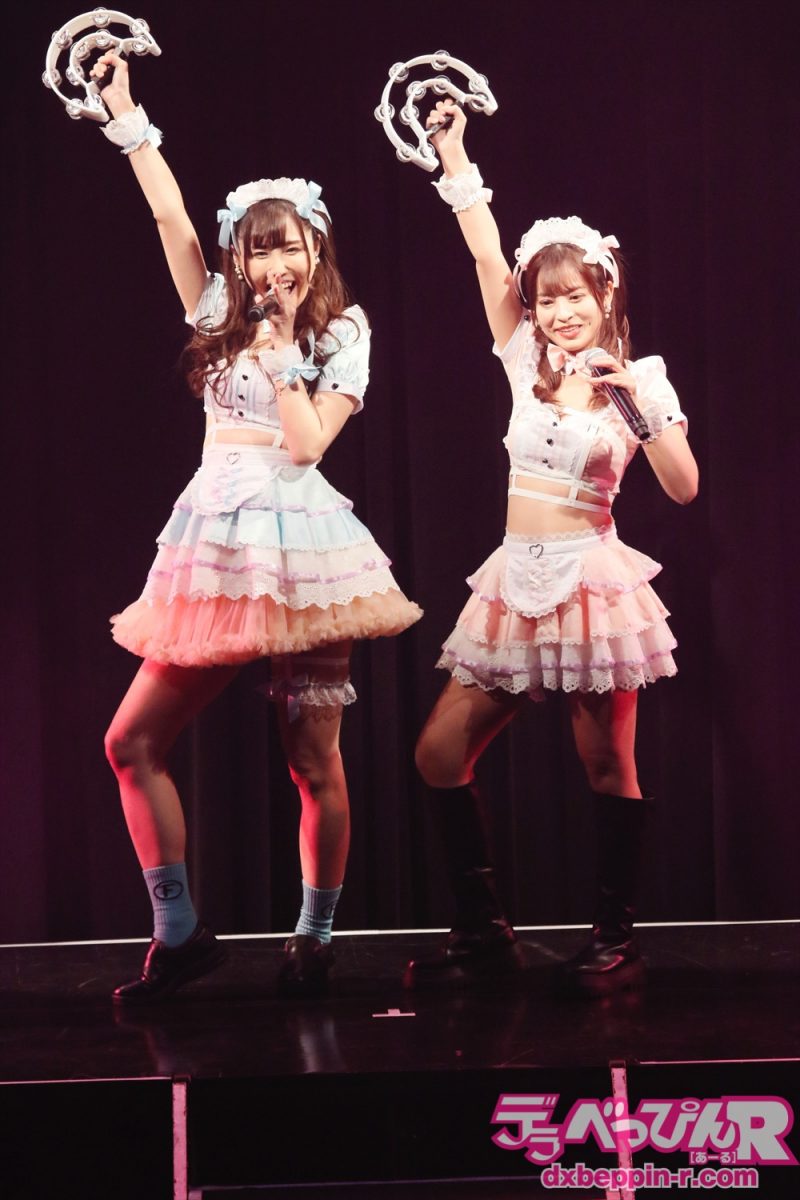 お揃いのメイド服風コスプレ姿で登場したキュートな2人は、初ライブとは思えないほど素晴らしい歌唱とタンバリンを使った振り付けを披露した。