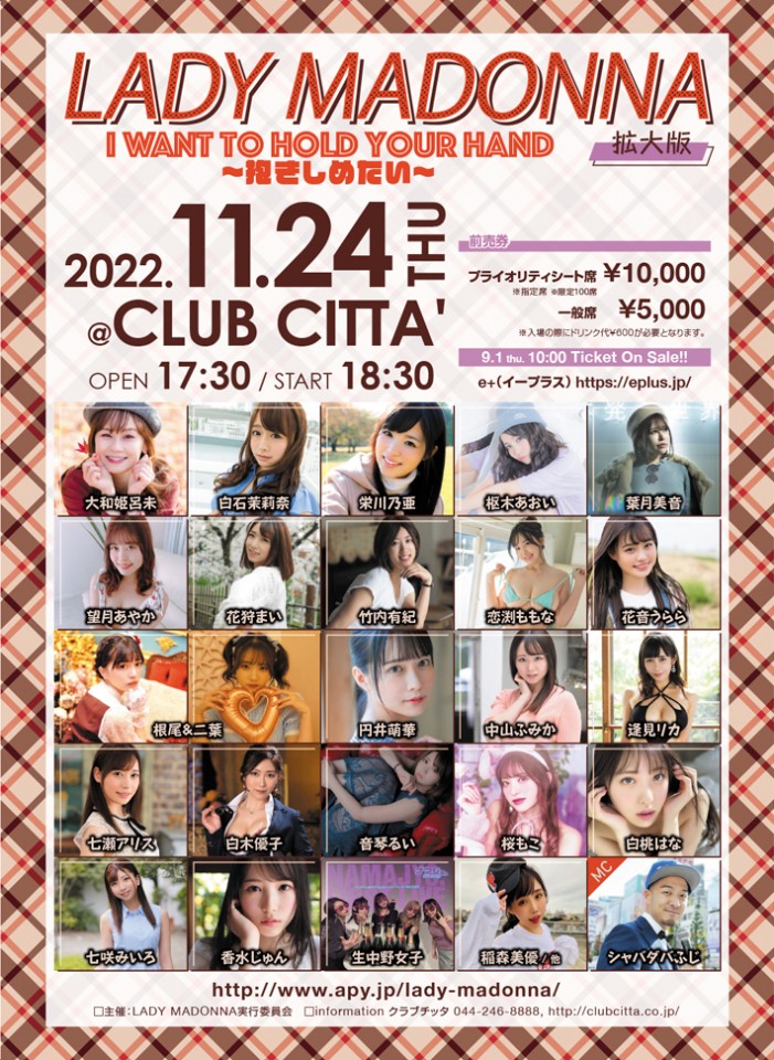 レディー・ガガやマドンナのような才能ある歌姫の名前にあやかったライブイベント「LADY MADONNA拡大版2022」が11月24日行われ、セクシー女優やセクシーアイドルグループら総勢29名が出演した。同ライブはアダルト界最大のイベントであり、会場もロックの殿堂である神奈川県川崎市のCLUB CITTA’で開かれたのだ。