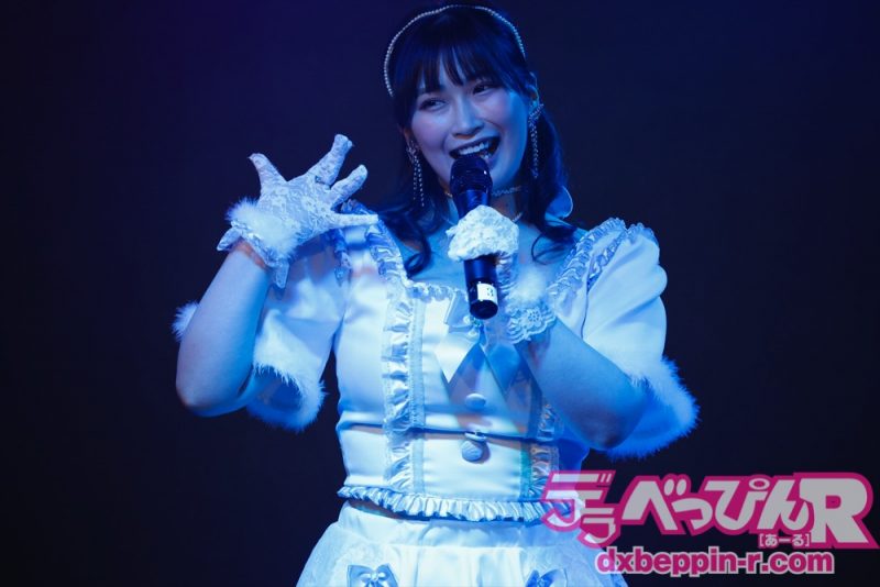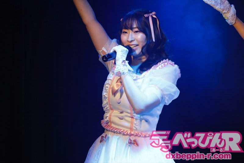 2曲目は昭和アイドルの名曲で煌びやかなステージを披露。誰もが知っている楽曲だけに、客席もノリノリでサイリウムが振られ盛り上がりました。このように「誰もが知っているので盛り上がるカバー曲」というのは、まだオリジナル曲が少ないAV女優アイドルグループには必要なのです。
