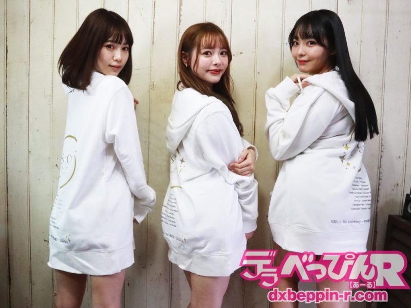 3人はこの日のためにつくられたオリジナルパーカー着用。バックプリントにはSODstarのロゴとSODstar17名の名前が入っていました。ビッグサイズのパーカーから伸びる生足には思わずキュンときてしまいます。