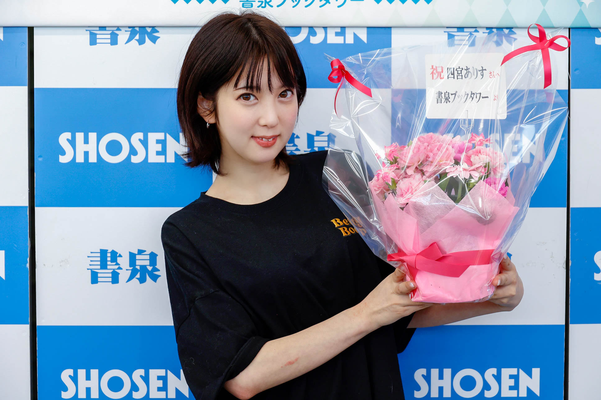 「みなさん髪が長い四宮は知っていると思うんですけど、写真集ではめちゃくちゃショートカットなのでさらに新鮮な四宮が見られます。ショートカットな私が写真集では見どころです。よかったらショートカットの四宮も推してください! これから『みんなの彼女』として、アイドル感覚の彼女バージョンで推される存在になり、それを凝縮し世界征服をしたいです(笑)」