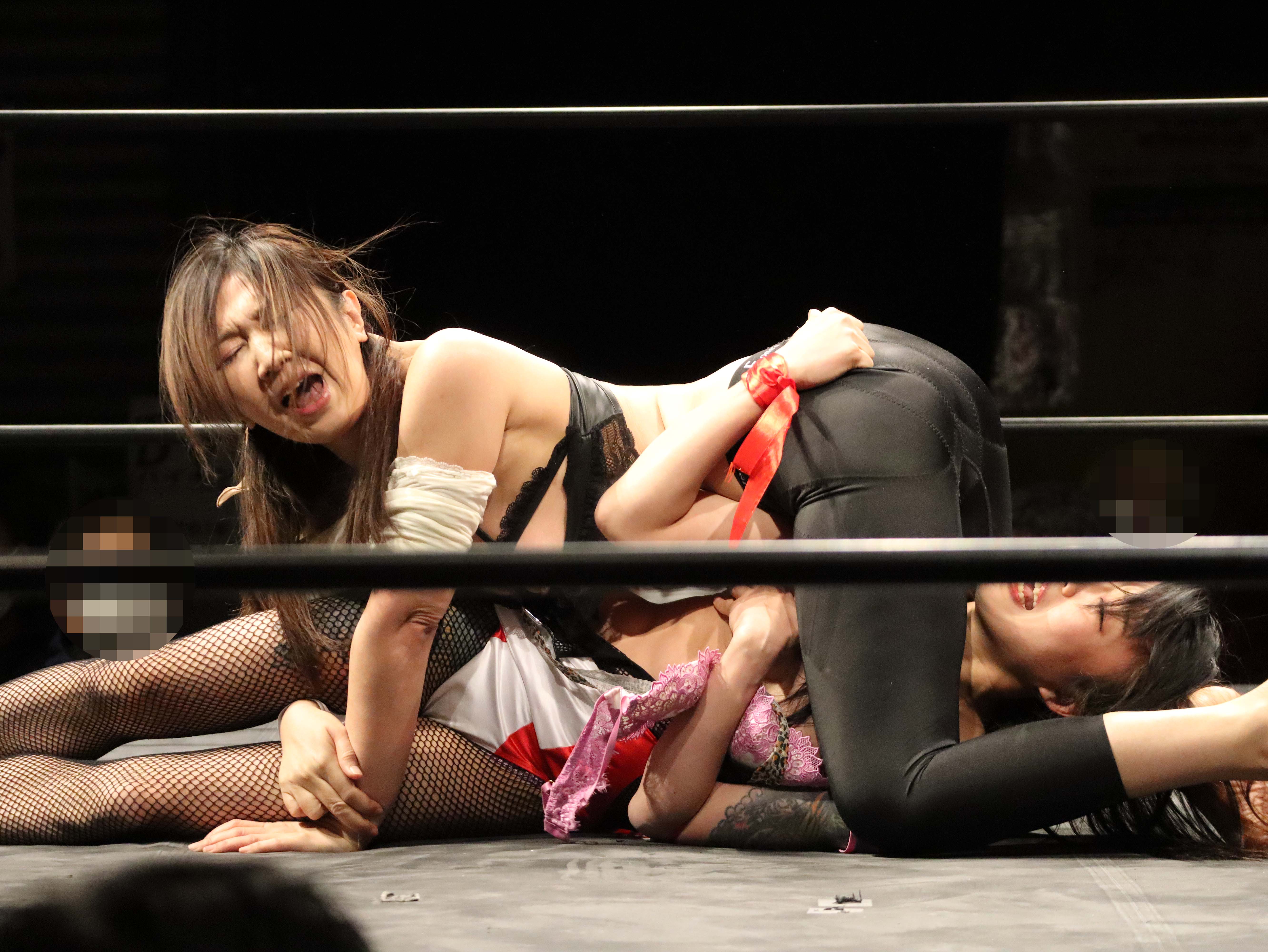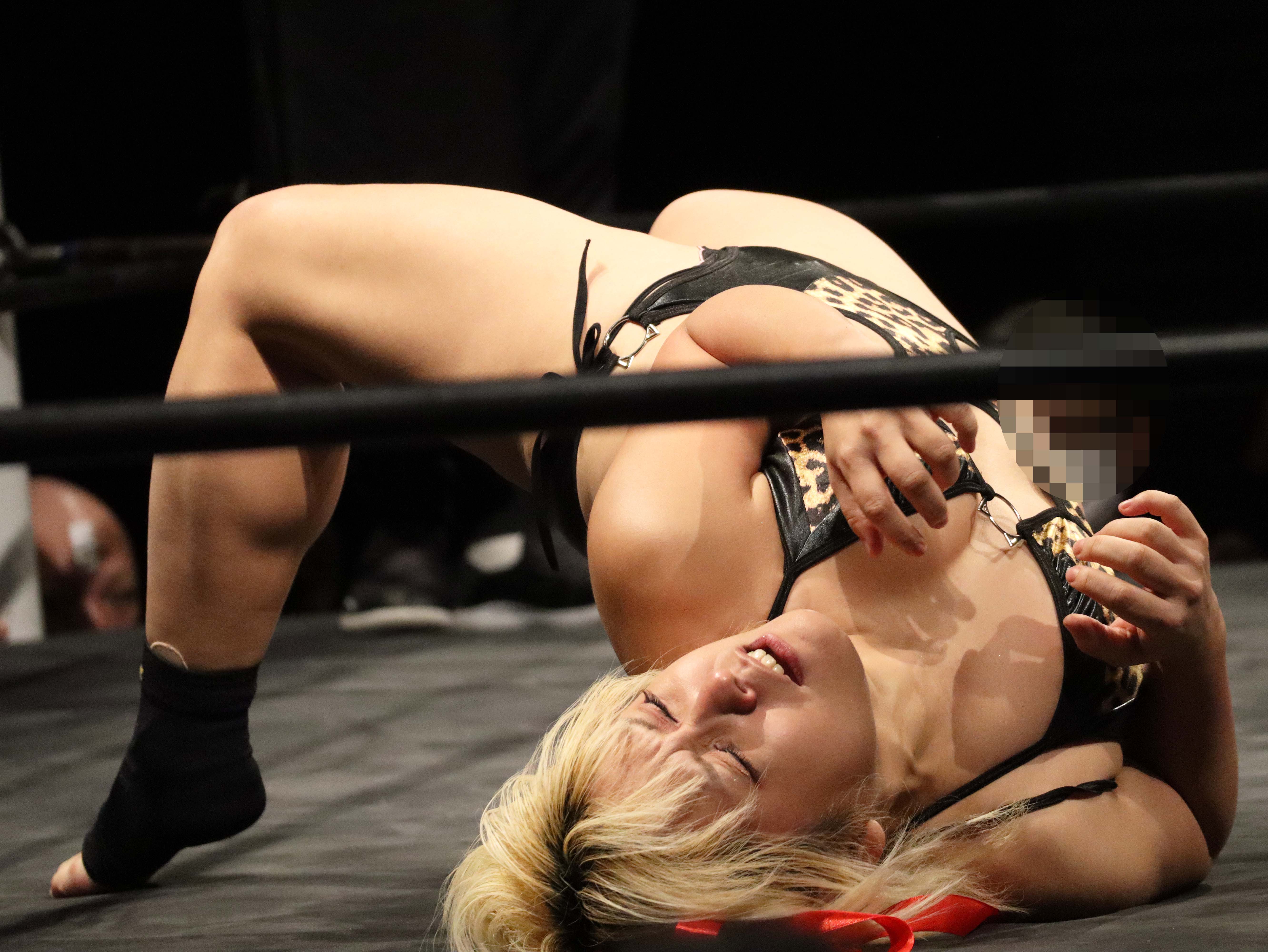 快感に抗うことなく、盛大にリング上でイキまくる山村茜。一方、紫龍みおは内股になりながらも必死の形相で耐える!
