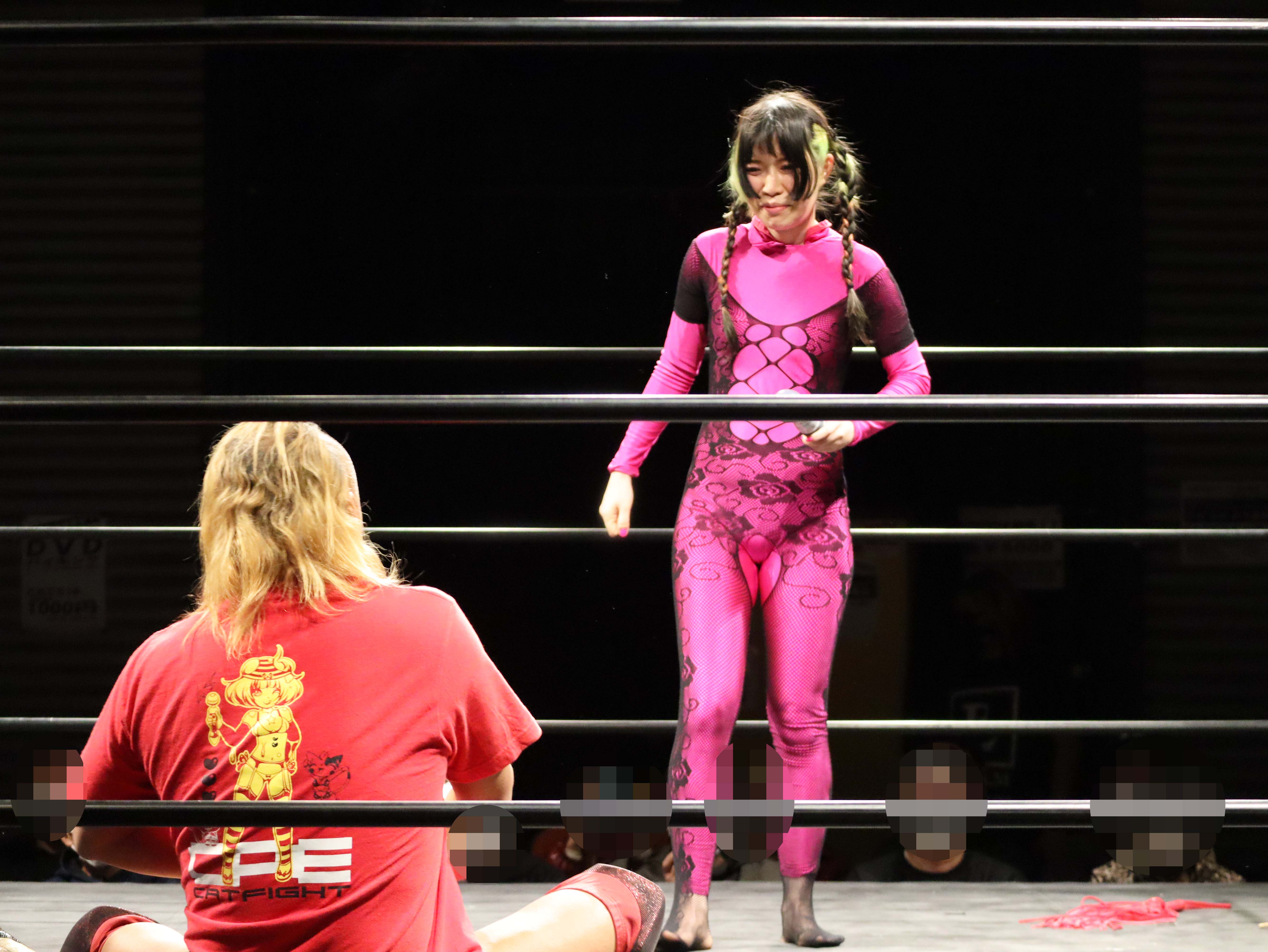 金的蹴りからの縄縛り、鞭打ちなどで佐野を果敢に攻めていた中身。しかし佐野のパワープレイを前にあえなく撃沈。5分47秒で中身がタップし、佐野直の勝利となりました。