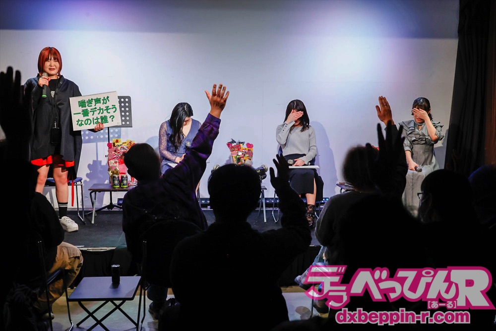 その他にも「一番、男性に依存しそうな人は誰?」などのアンケートが行われ盛り上がりました。このようなファン参加型のゲームは会場にいると一緒に楽しむことができますので、ぜひ会場に足を運び出演者と交流を深めましょう。