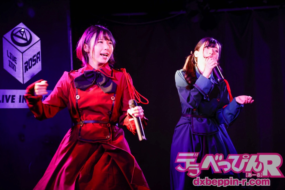衣装もバッチリ決めてアイドル曲やボーカロイド曲を歌いトップバッターらしく盛り上げてくれました。ステージの最後には「百合」の世界を彷彿とさせる姿も見せてくれて、世界観を構築。今後、様々なライブベントに出演する大注目のユニットです!