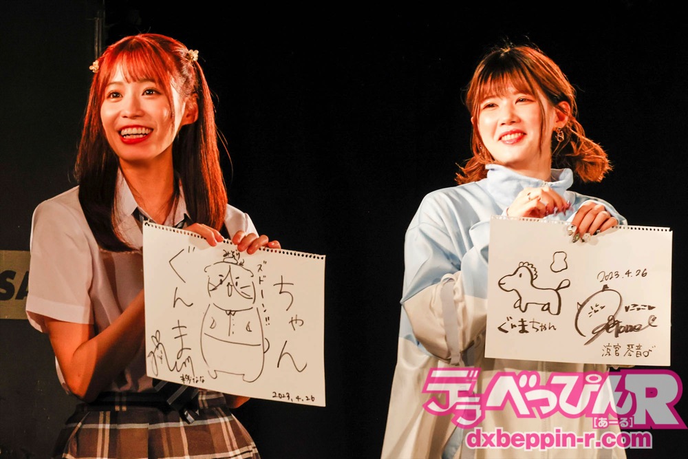 ここで前半組は終了し、ライブ恒例のお絵描きコーナーに入ります。今回は群馬県のマスコットキャラクターである「ぐんまちゃん」がお題ですが、馬ではなく別の動物を描く女優が続出。その中でももなかちゃんがかなり忠実に再現し優勝しました。