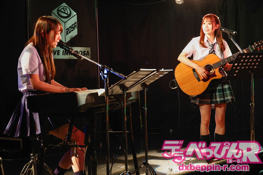 ソロで2曲歌ったあと、「みなさん驚かないでください。スペシャルコラボで未歩ななちゃんとコラボします」とファンに伝えると、キーボートが用意され、清華ちゃんがキーボード、ななちゃんがギターを弾き女性デュオとアイドルグループの楽曲を2人で歌います。