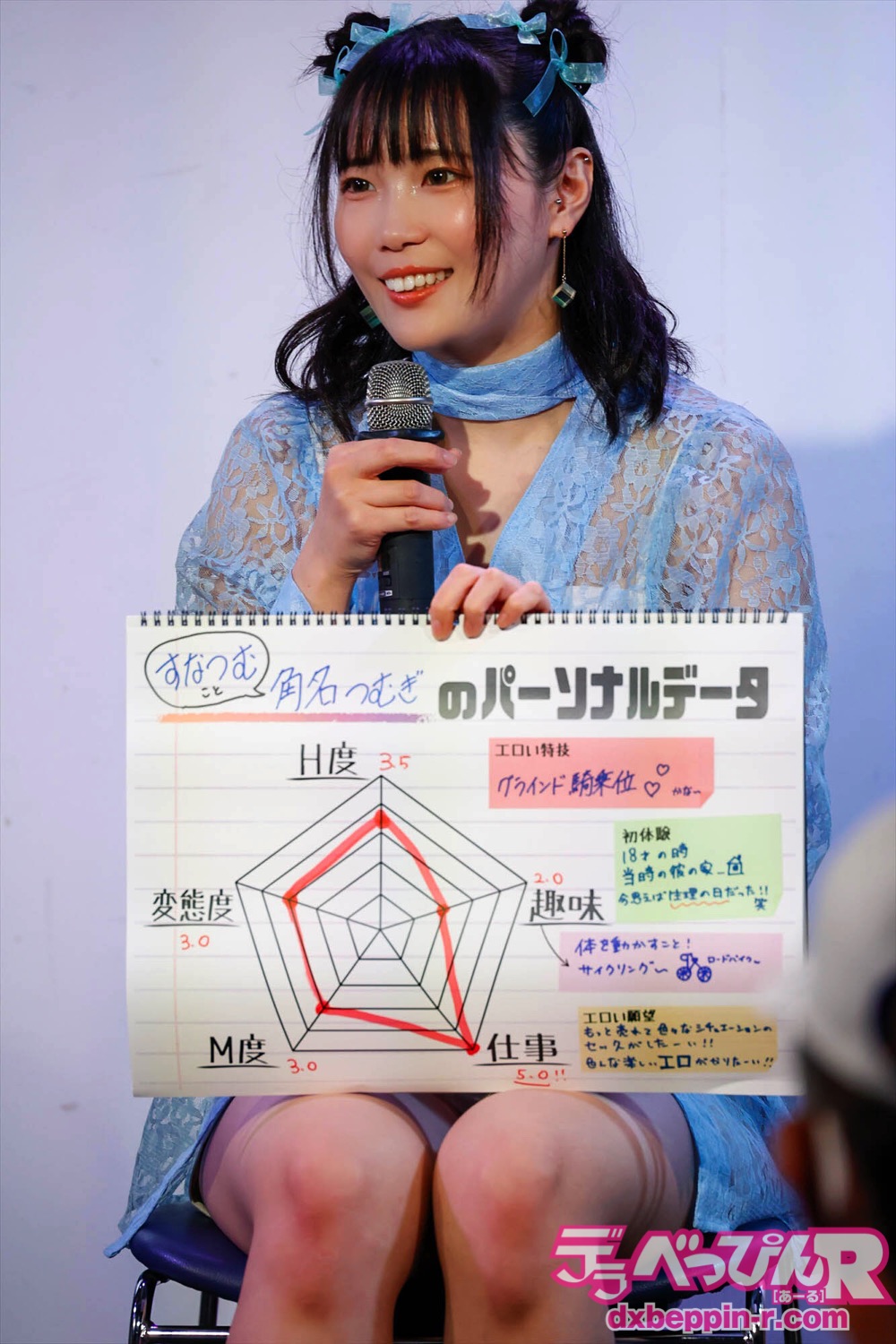 しかし、健康的なエピソードを披露したつむぎちゃんも仕事話では、「いろんなことや楽しいエロがやりたいです。『GIGA』や全身タイツの作品が楽しかった。拘束されるとニコニコするんです」と拘束好きなことをカミングアウト。