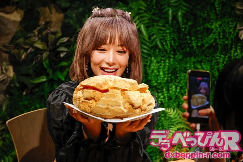 のぞみちゃんは巨大シュークリームをセクシー女優らしく金玉に例えて、「いっぱい溜まっているね」、「大きい~」とエッチなコメントをしながら食レポ。