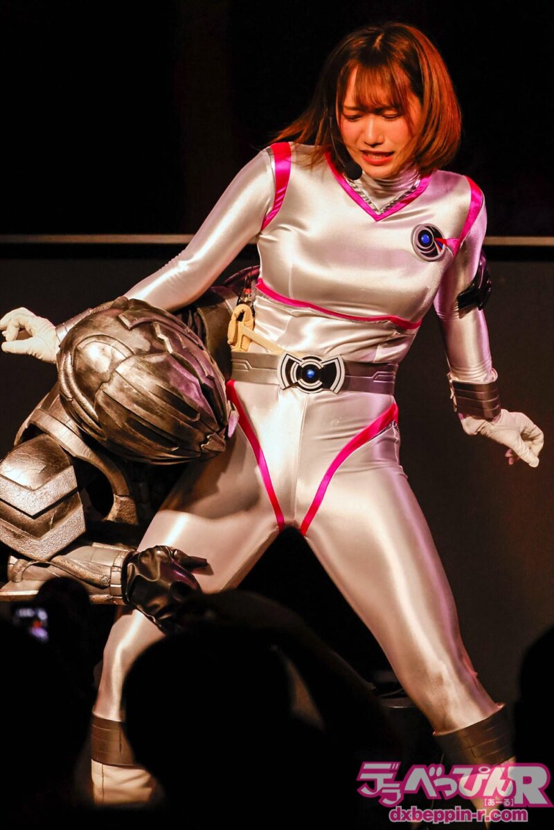さらには股間やお尻を観客に突き出され、集中的に攻撃を浴び、もはや敗北直前。そこに、囚われていたひな実ちゃんが連れてこられ反撃を試みますが、アイマスクを剥がされ素顔が晒されるとピンチに。