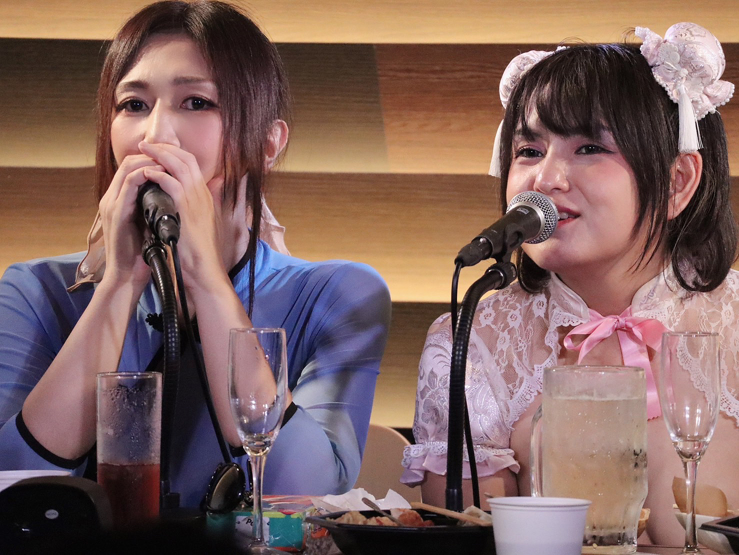 ラストのトークコーナー『ほろ酔い危ないトーク』で、それぞれが横浜にまつわるエピソードを披露。紗々ちゃんが高校時代に都筑区の田んぼでカーセックスした話や、茜さんオススメの中華粥のお店の話、さらに伊織さんが学生時代から横浜で好みの男性をナンパしていたという驚きの逸話で大盛り上がり! 京都人のかおるさんは、横浜の思い出がいっさいないということで「おっぱいで勘弁」と、紗々ちゃんに爆乳を押し付けていました(笑)。