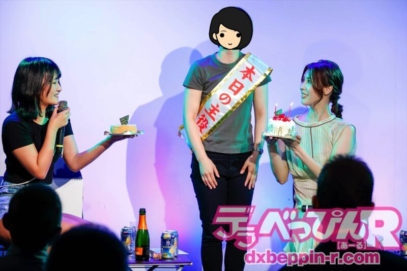 このようにトークで盛り上がっていると、本日の主役である女子マネージャーにバースデーケーキが贈られます。ケーキのロウソクを吹き消すと、女優陣に挟まれ記念撮影タイムに突入。照れつつもにこやかな表情で写真に収まる女子マネージャーでした。